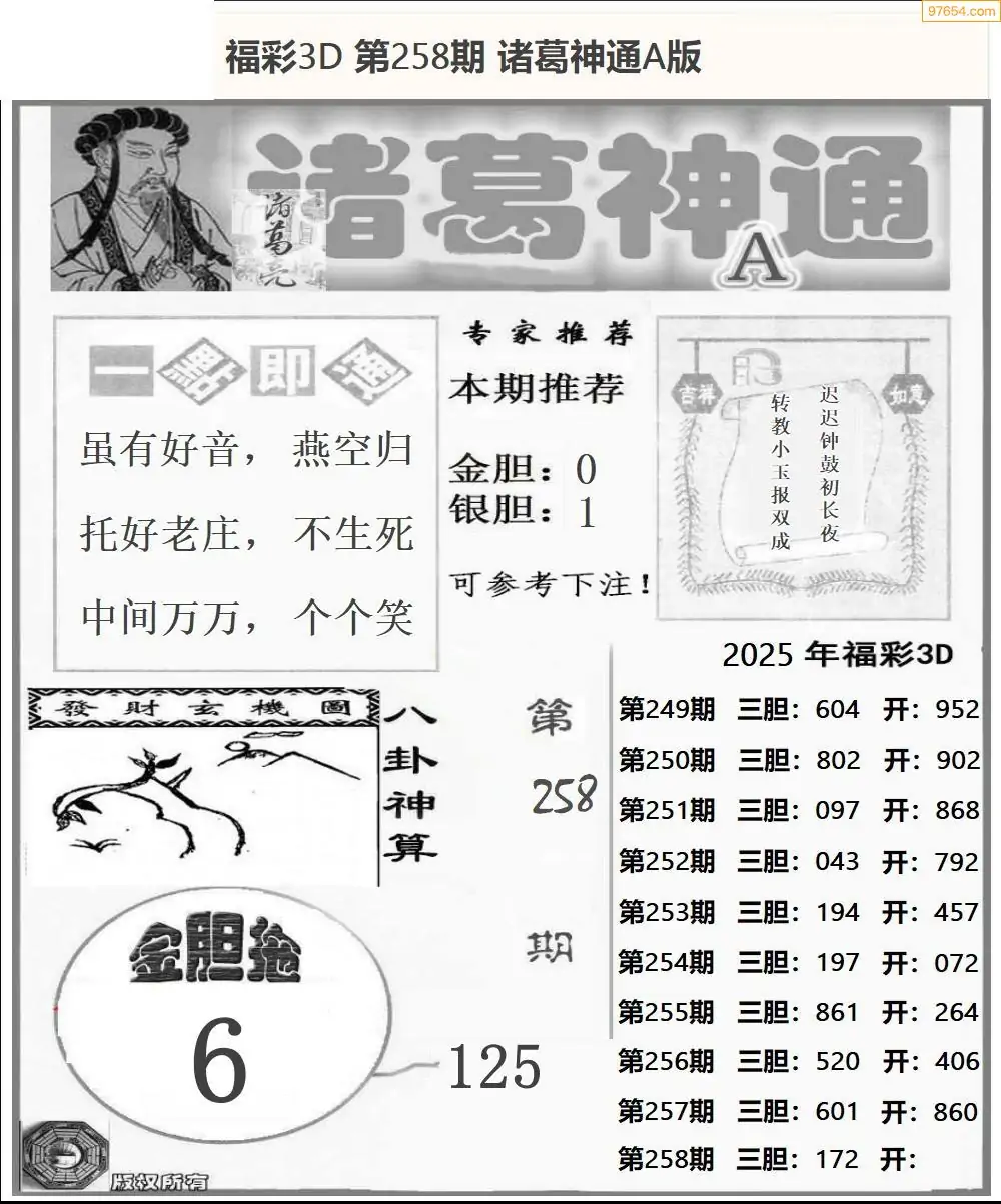 25258期福彩3D诸葛神通a