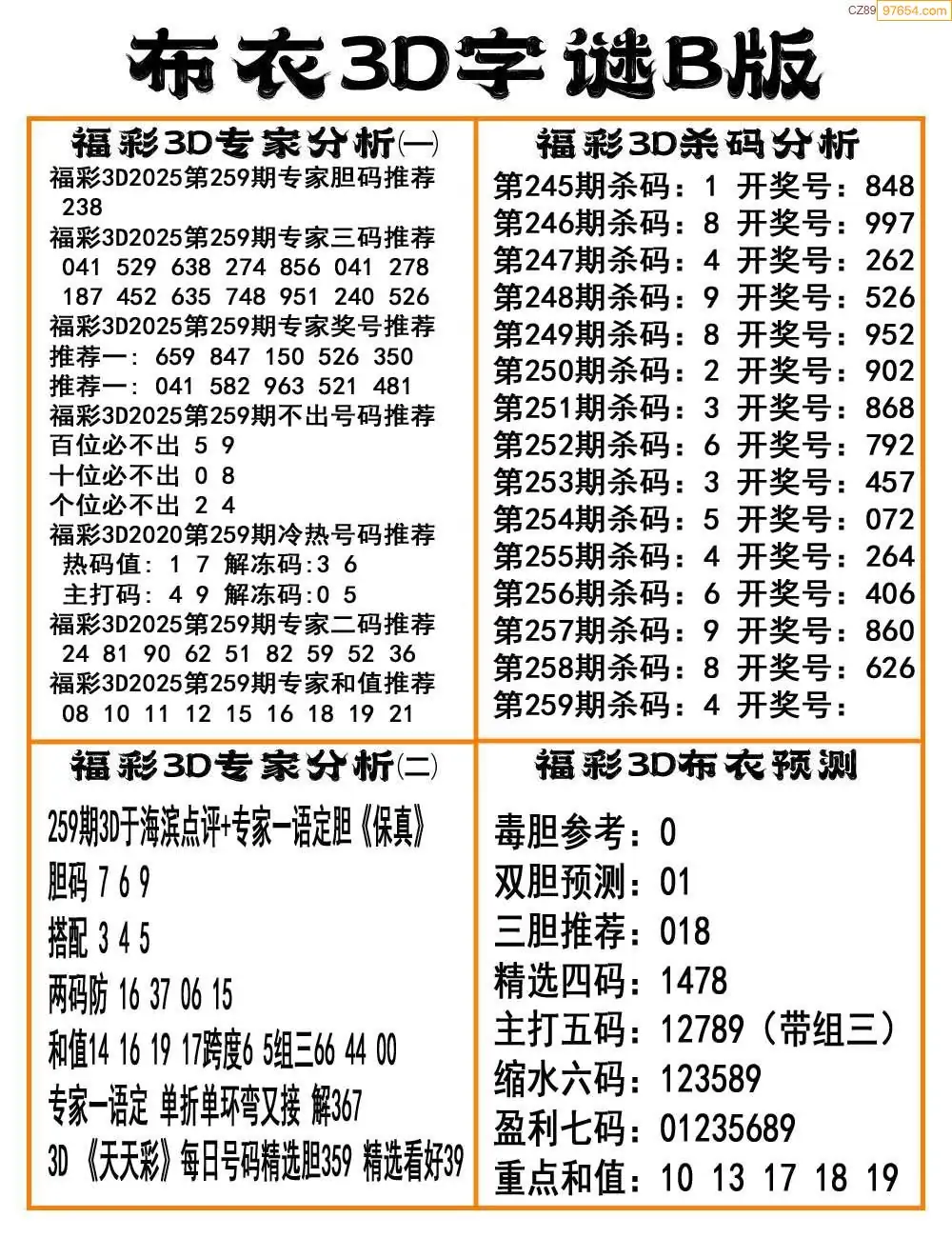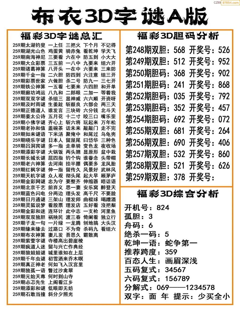 福彩25259期布衣3d字谜ab