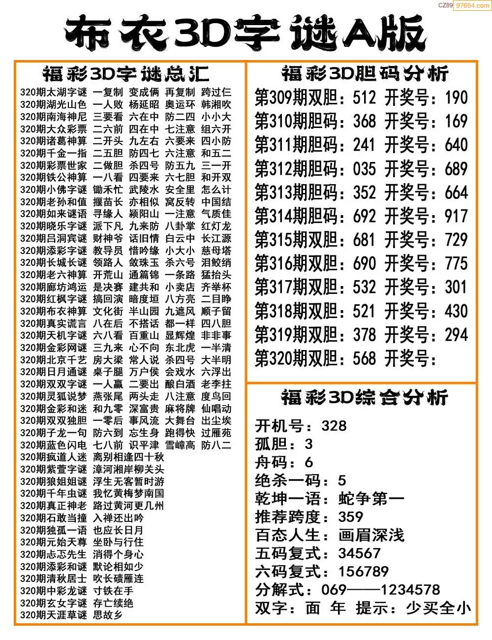 福彩25320期布衣3d字谜ab