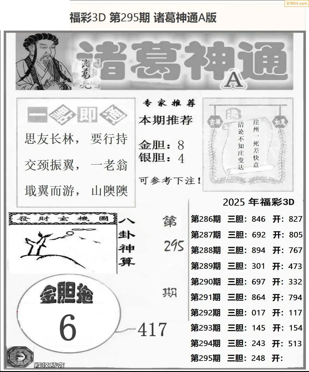 25295期福彩3D诸葛神通a