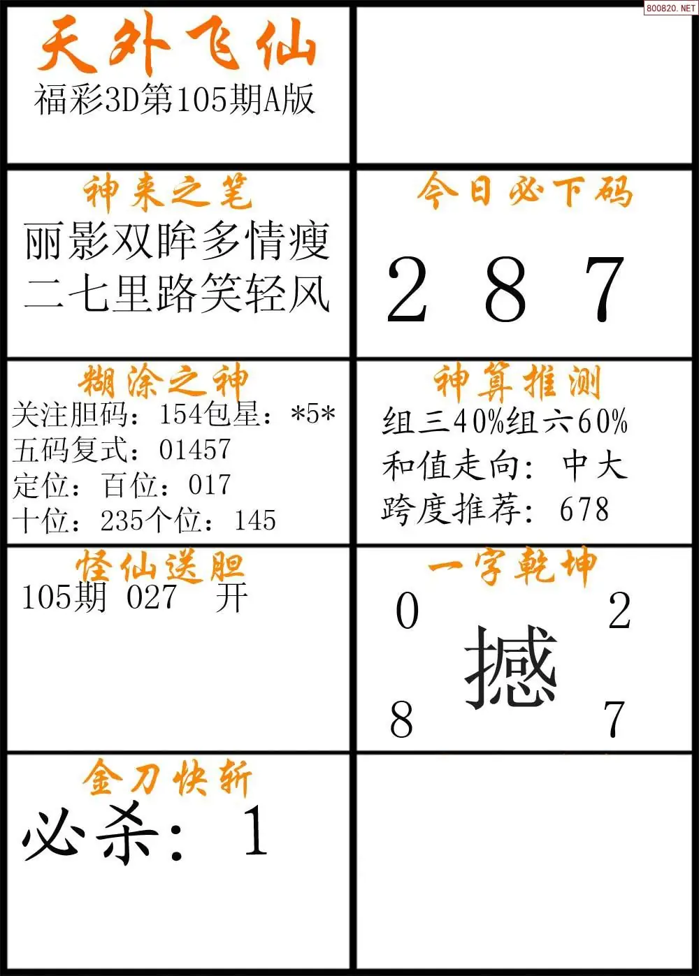 105期福彩3d天外飞仙A版