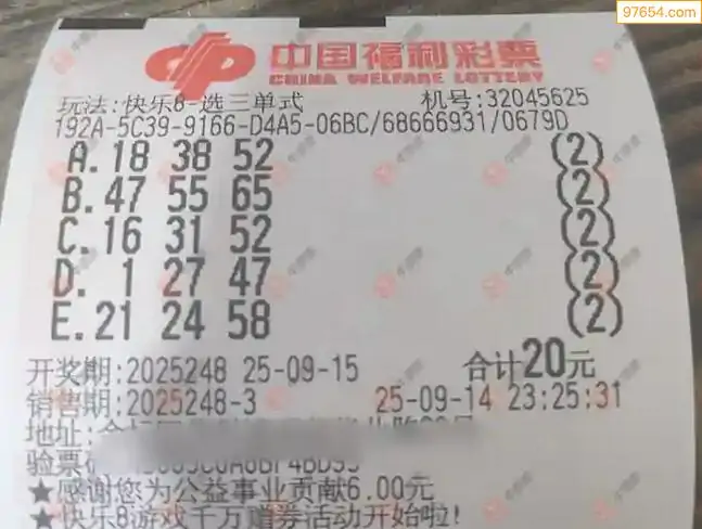 25248期福彩快乐8选三单式实票