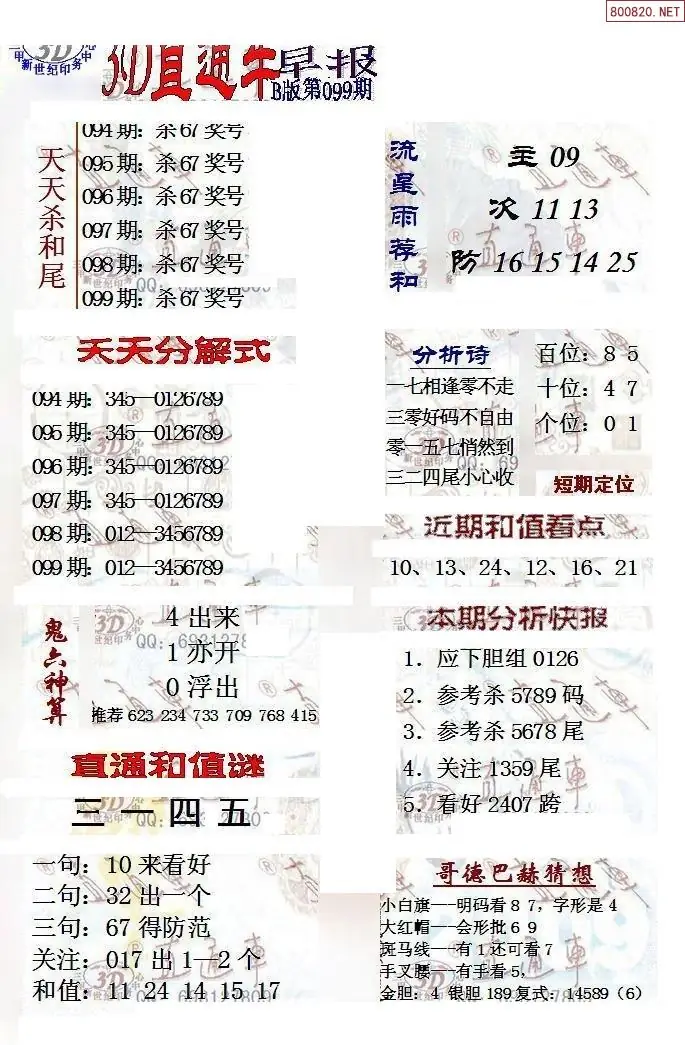 26099期晚秋和值谜胆码推荐