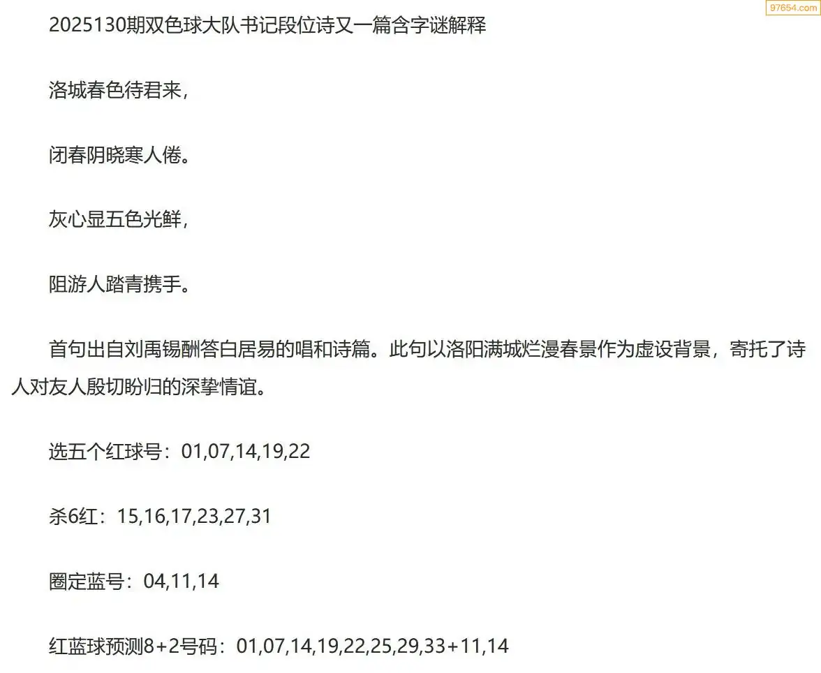 大队书记双色球25年130期段位诗谜