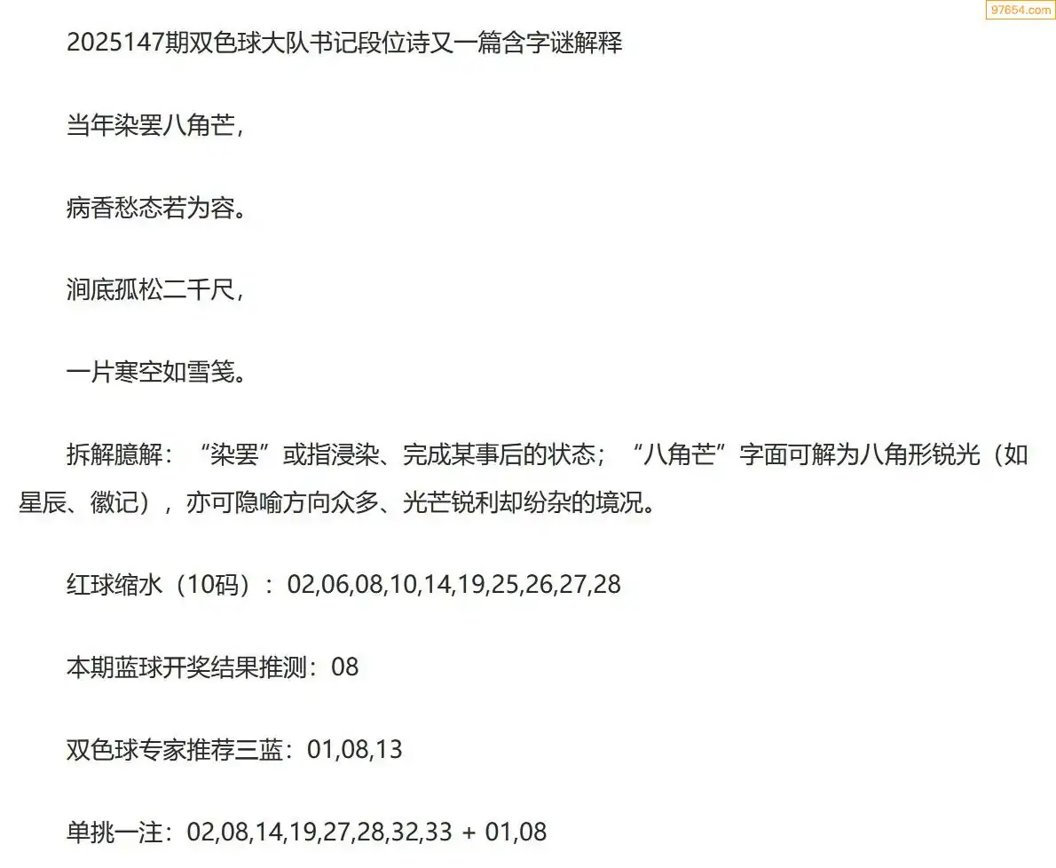 大队书记双色球25年147期段位诗谜