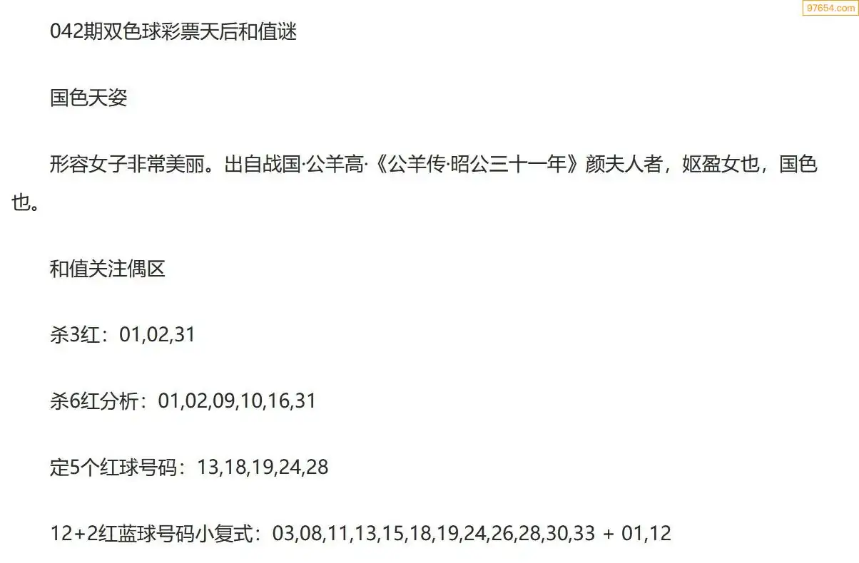 彩票天后双色球26年042期今日和值谜