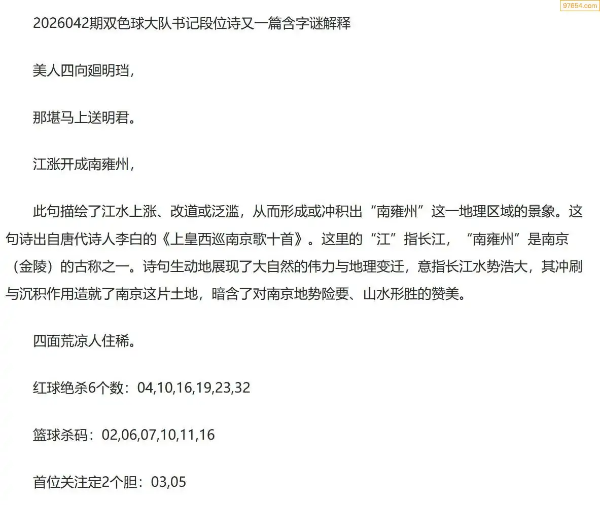 大队书记双色球26年042期段位诗谜