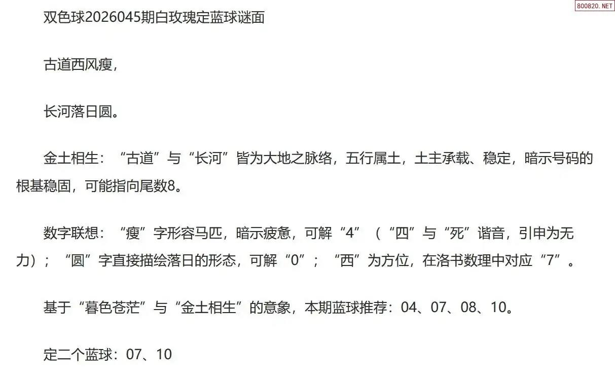 白玫瑰双色球26年045期定蓝球字谜