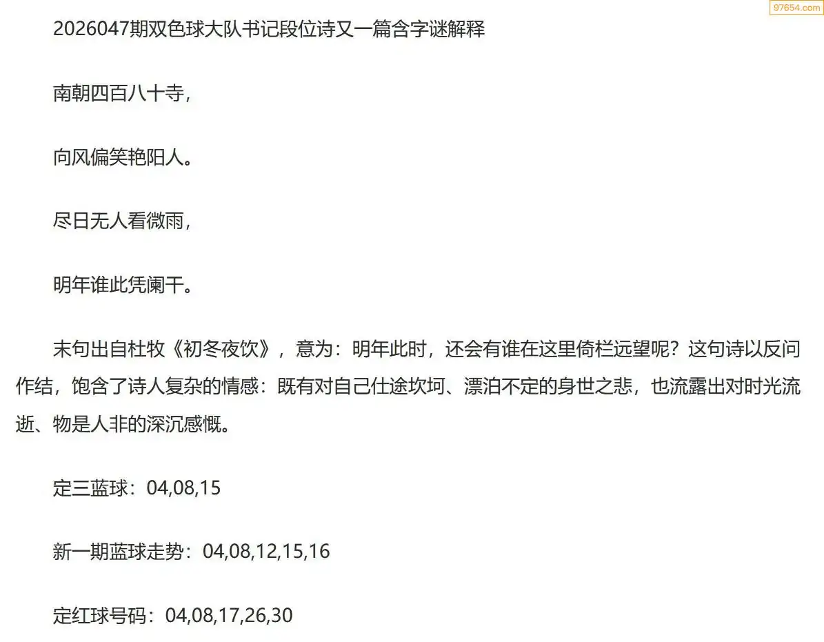 大队书记双色球26年047期段位诗谜