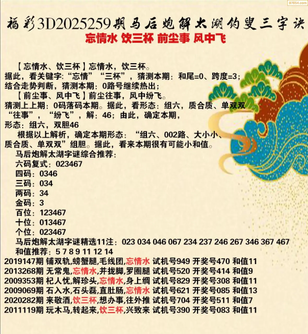 25年259期马后炮解3d太湖钓叟之 饮三杯