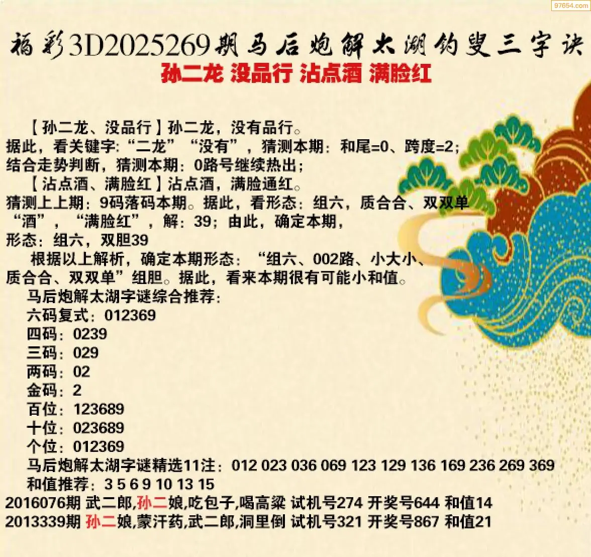 25年269期马后炮解3d太湖钓叟之 孙二龙