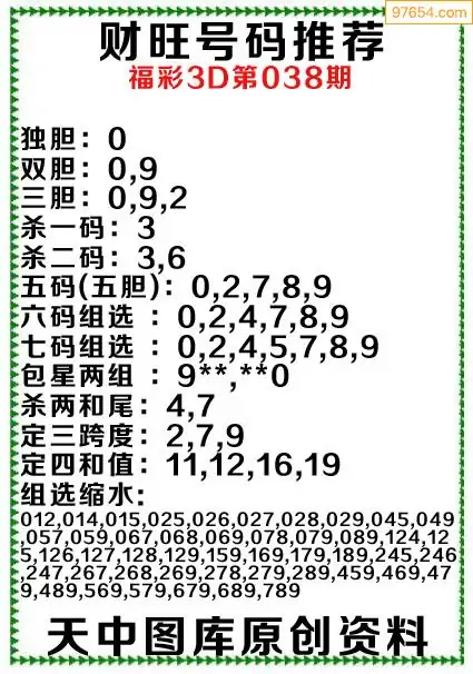 3D原创038期旺财出号推荐